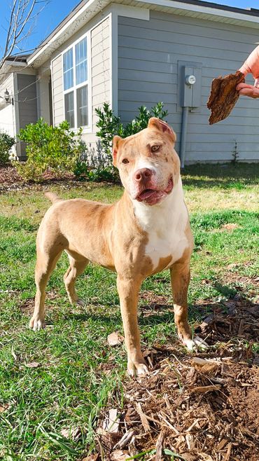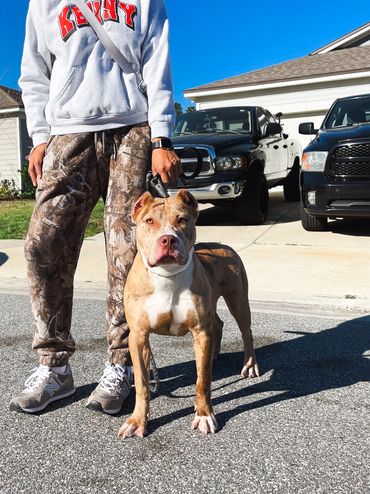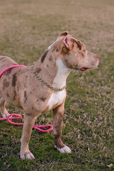 Lyla is our stunning XL Bully who represents everything we strive for in our program. While she carries the size and presence of an XL, she will produces medium-sized dogs — perfect for families who want balance in build and lifestyle. Her structure is strong and correct, giving every pup a solid foundation.